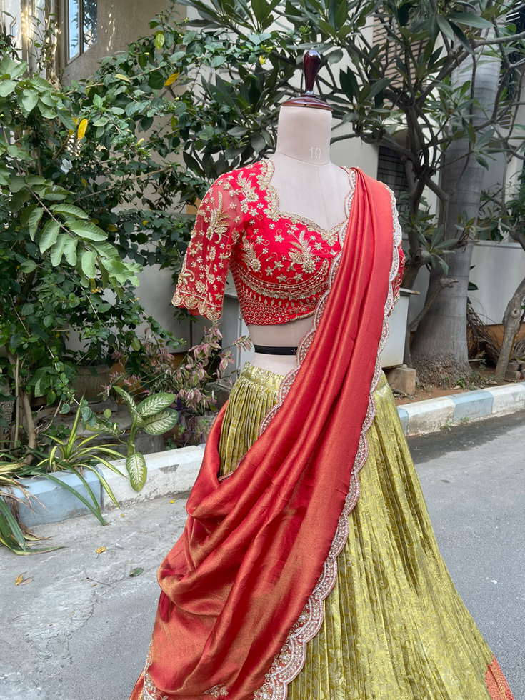 Step into a world of timeless elegance with this Pure kanchi tissue lehenga. Meticulously handcrafted by artisans in Hyderabad, this piece embodies the "personalized imperfection" that defines true luxury. Designed for the modern global woman who cherishes her roots, it blends traditional Kanchipattu with a contemporary silhouette.