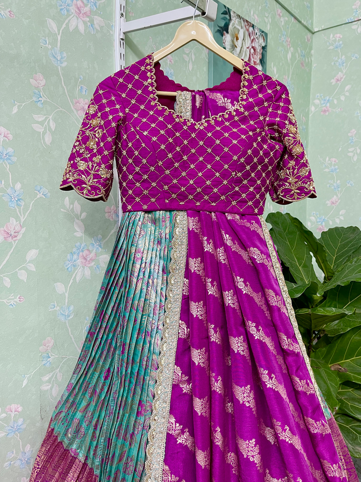 Step into a world of timeless elegance with this Seagreen/blue Kanchipattu lehenga. Meticulously handcrafted by artisans in Hyderabad, this piece embodies the "personalized imperfection" that defines true luxury. Designed for the modern global woman who cherishes her roots, it blends traditional Kanchipattu with a contemporary silhouette.